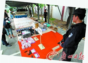 4月22日,东莞市公安局在省公安厅统一指挥和陕西警方的支持下,破获“330A”特大武装制贩毒案件,抓获潘某斌等犯罪嫌疑人15名,捣毁制毒工场1个,缴获K粉约246千克、冰毒约8千克、麻古约33千克、制毒原料羟亚胺1025千克,查获美式制式手枪和仿64手枪各1支、子弹31发,扣押毒资人民币250多万元,作案车4辆。