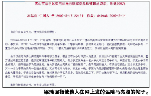 这篇名为《书记情妇连同情夫盗走保险柜》的网帖里,讲述了2008年6月25日上午10时,马亮照位于佛山市高明区荷城街道的住宅离奇失窃,涉案财物高达500多万元。