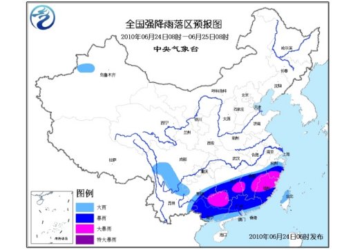 中新网6月24日电 中央气象台24日6时继续发布暴雨黄色预警:预计,6月24日8时到6月25日8时,贵州南部、湖南中南部、江西大部、浙江中南部、福建、广东大部、广西等地有大到暴雨;广西东北部、湖南东南部、江西中部偏东和中部偏西、浙江南部、福建中北部等地的部分地区有大暴雨。