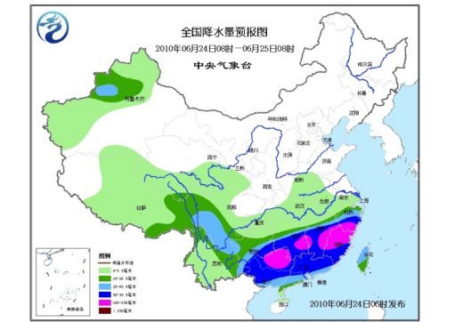 24日08时至25日08时,西藏大部、青海东部和南部、川西高原等地有小到中雨(雪)或雨夹雪,新疆中西部、甘肃南部、黄淮西部、江汉大部、江淮西部、江南、华南以及西南地区大部等地有小到中雨或阵雨,其中,贵州南部、湖南中南部、江西大部、浙江中南部、福建、广东大部、广西等地有大到暴雨;广西东北部、湖南东南部、江西中部偏东和中部偏西、浙江南部、福建中北部等地的部分地区有大暴雨;上述部分地区并伴有短时雷雨大风等强对流天气。另外,新疆天山西部、云南东部、川西高原南部、西藏东部等地的部分地区有大雨。新疆北部和西部有4~6级风,山口地区风力可达8~9级,新疆南疆盆地的部分地区有扬沙或浮尘天气;内蒙古东部和西部有4~5级风。东海北部海域将有4~6级偏东风转6~7级、阵风8~9级的东北风;东海南部海域、台湾海峡、台湾以东洋面将有西南风5~6级增加至6~7级、阵风8级;南海北部海域、北部湾将有5~6级西南风。