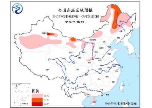中新网6月24日电 中央气象台6月24日06时继续发布高温蓝色预警:预计,今天白天,甘肃西部、宁夏北部、内蒙古大部、黑龙江大部、吉林西部、山西西南部、陕西关中地区、广东雷州半岛、广西西南部的局部地区、海南中北部等地有35~37℃的高温天气,其中,内蒙古西部的局部地区最高气温可达40~41℃。