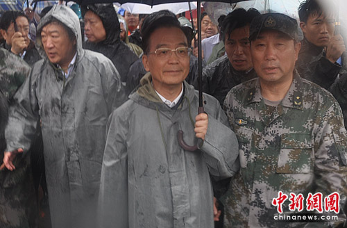 在罗针镇,温家宝冒雨在罗针镇高速公路的罗针收费站下车,直接到了险情的岸边,慰问现场抢险的人员。他和抢险的武警官兵亲切握手,并即兴发表了讲话。