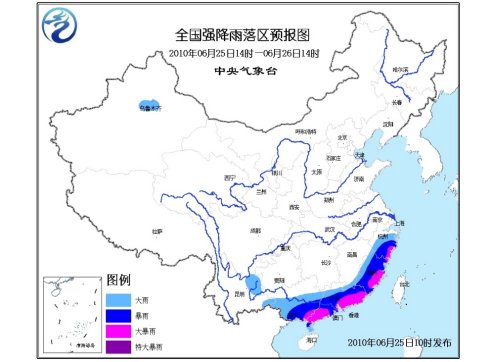 中新网6月25日电 中央气象台6月25日06时继续发布暴雨黄色预警:预计,6月25日08时到6月26日08时,浙江中南部、福建大部、广东、广西中南部有大到暴雨,其中,广西东部、广东东部及云浮地区、福建东部等地的部分地区有大暴雨;上述部分地区并伴有短时雷雨大风等强对流天气。另外,云南东部的部分地区有大雨。