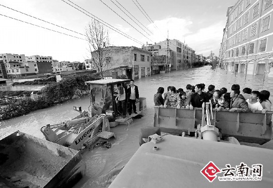 大水淹没马龙县城的主街道之后,要进入城区,又高又大的装载机成了唯一的交通工具,也成了轮渡公交,城里地势较高的地方成了码头。坐上这些装载机,灾民们从城内纷纷撤了出来……昨天,副省长孔垂柱到达马龙考察灾情时,同样是站在了装载机上。而本报记者也一同爬上装载机,一路进入城区。