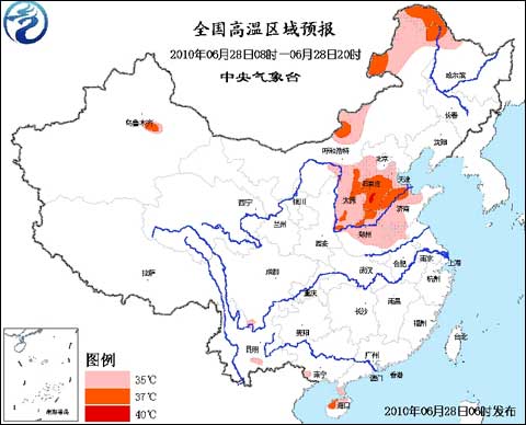 中新网6月28日电 中央气象台2010年6月28日06时继续发布高温蓝色预警:预计,今天白天,内蒙古东北部和中部的部分地区、黑龙江西北部、山西、河北大部、天津、河南中北部、山东中西部、安徽北部、江苏西北部、广东雷州半岛、海南北部等地有35~37℃、局地38℃的高温天气,其中,河北南部的局部地区最高气温可达40℃。