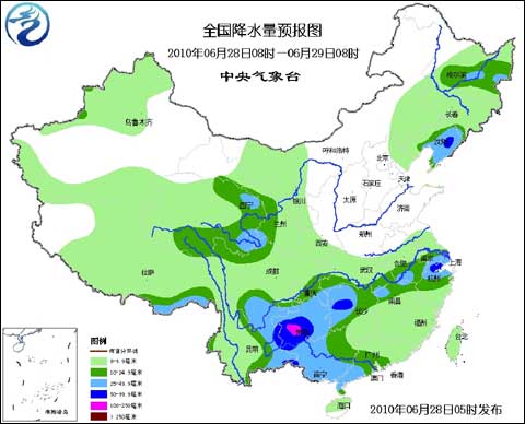6月28日至29日,江南中北部、西南地区东部将有5~25毫米降雨,局部地区有30~60毫米,东北地区有3~15毫米、局部地区20~25毫米的阵雨或雷雨;