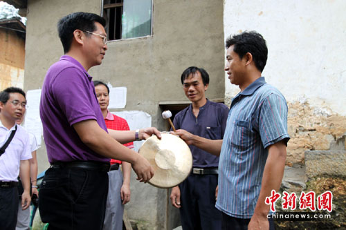 中新网柳州6月28日电(蒙鸣明 谭凯兴)“只要发现有地质灾害隐患,就立即敲响铜锣,通知全屯群众撤离到安全地带……”连遭暴雨袭击的广西柳州市融安县为防御地质灾害,将1438面铜锣配发到全县所有村屯,并由专人巡查,为村民安全撤离赢取更多时间。