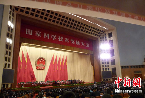 1月14日,中共中央、国务院在北京人民大会堂举行2010年度国家科学技术奖励大会,中国国家领导人胡锦涛、温家宝、李长春、习近平、李克强等出席大会。中新社记者 孙自法 摄