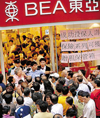 东亚银行上周三受到不利谣言影响,港九多家分行出现排队提款人龙。东亚银行为了加强市民信心,当日更特别延长服务时间半小时。该行管理层强调,东亚银行有足够资金应付市民提款,而被提走的存款金额,相对该行所预备的金额只占很少数目。