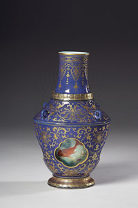 清乾隆磁胎洋彩青地金花鱼游春水瓶