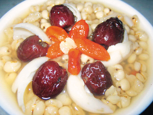 取薏仁米50g、百合15g、粳米100g、蜂蜜适量。将薏仁米、百合、粳米入锅加水煮至熟烂,入蜂蜜调匀,出锅即成。分2次服完。此粥有健脾益胃,泽肤祛斑功效。可用于治疗妇女面部雀斑、痤疮、湿疹等症,对痈肿、湿疮有治疗效果。