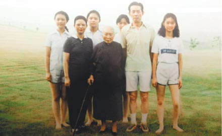 一九八一年王永庆(右二),与母亲王詹样(右三)在长庚球场合照,身边还有夫人李宝珠(左二)和四个千金。联合报系资料照片