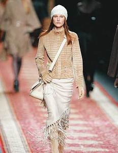 款式搭配:流苏是安装在衣服上的钟摆,Jean Paul Gaultier 为Hermes设计了不少流苏,粗犷的皮条流苏与细密的丝绸流苏形成鲜明的对比,但皆依靠中性化的装束统一在品牌不变的女骑士精神中。