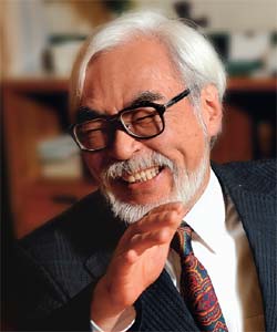 六十七岁的宫崎骏,满头白发、白胡须,只有黑框眼镜后的两道眉毛是黑的。平常总是一身轻便工作服的他,这次为了接受国外媒体采访,特别换上笔挺西装,神色显得有些紧张。然而,当话题聊开、气氛热络之后,宫崎骏一笑起来,眼睛就瞇成一条线,咧开的白牙里发出“嘻!嘻!嘻!”带着气音的笑声,像个调皮捣蛋却没被大人抓到的得意小男孩。