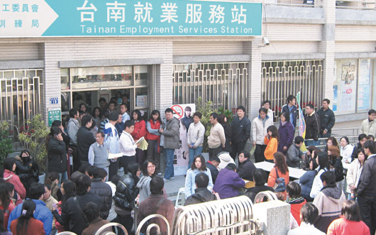 事实上过年前请领失业给付的人潮就涌现,约是平常的两、三倍。去年十二月请领失业给付人数达三万人,平均每日约一千人,年前两周每天约增至两、三千人。这段期间请领失业给付民众多数是做失业确认,也就是至少已失业两个月以上。