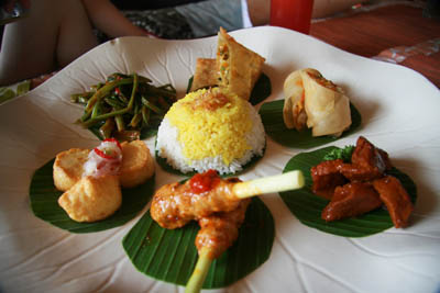 如果有剩余的猪肉,一般常将它捣得极细再加入盐巴和高料,灌制成香肠油炸保存。这种名符其实的香肠不必苦等庆典,眼尖的话,它就在巴厘岛的小食堂名路边摊上盘起油亮的身子任人宰割。