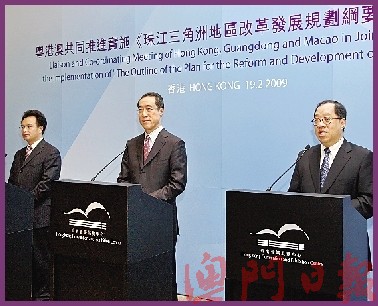 中新网2月20日电 《澳门日报》今日在头条刊发报道称,“粤港澳共同推进实施《珠江三角洲地区改革发展规划纲要》联络协调会议”19日在香港举行,粤港澳三地就四个重点工作达成共识。