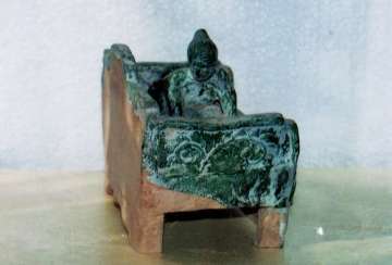 1、床:该床尺寸:长20.5cm,高:14cm,宽:12cm。从造型看汉代床的特征极为明显。该床由三部分组成:床板,边框,支架。该床为厚板与边框护板相连。床面上刻有几何形方格纹,又称钱眼纹,泉源纹,即,古铜钱中心方孔纹饰。寓意睡卧钱眼,后辈有钱。床上边框为左、后、右三面高护板组成。后护板中高、两低。每块护板上模印草花。寓意草繁茂盛。床板与边框护板相连放在四腿支架上。四腿支架前后又有护板。前护板上三个方格内有卷草模印图案,后护板无釉无纹为黄泥土胎。