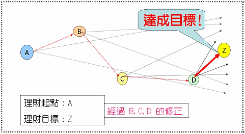 经过一段时间,理财阶段来到了C点,似乎又偏离了当初既定的方向。就又是“适时调整”的时候,所以重新找出新方向,即从C点至Z点的双箭头所涵盖的范围。在投资理财的过程中,会不断的重复B点、C点、D点等的修订调整。