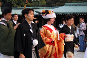 每回听到这句话的时候,我周围盛装的日本来宾谁也不惊奇,大家笑容满面,温暖的目光始终从正面看新郎新娘,中间不存在任何隔阂。这时恐怕只有我一个人纳闷儿!