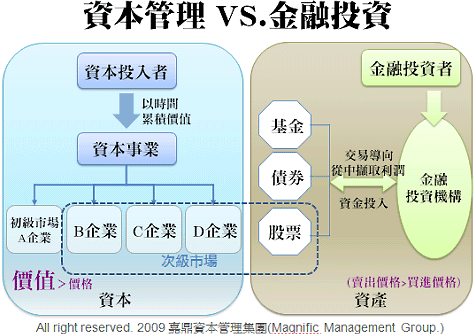 资本管理则是截然不同的取向。资本管理的焦点,在于“事业”(或是企业)上,资本投入者的眼光和视野,完全着重在:“这个企业容易理解吗”、“我能否掌握它的长期经济特质”、“管解阶层正直可信吗”,并透过合理价格,取得企业一部分的未来。