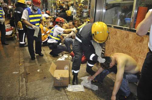 事发昨晚七时四十五分左右,当时正下着大雨,有人在上址以两个汽水胶樽盛镪水掟落街,在一名内地游客身旁跌落地,撞击溅出的液体冒出白烟,在现场数十名游人误为有人扔垃圾,惟随即感到皮肤剧痛,才知“中招”,受惊纷纷狂叫,四散跑入附近的店铺求助。职员实时扶伤者到安全地方,同时取清水让各人清洗伤口。多辆救护车赶往救援,将伤者分送医院。警方则动员逾二百人进行调查,现场通宵未能解封。