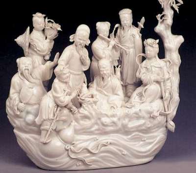 例如附图乃清代烧制的德化白瓷塑精品《八仙过海》摆件(长三十公分)。八仙形象不同,显现不同身份及个性。明、清期间,德化白瓷和其它瓷器与雕塑品(如竹刻、木刻、象牙刻等),皆流行八仙的造型,除了与道教有关外,主要是八仙富有人情味和诗的意境,更能满足世俗心理。其实八仙代表不同阶层的男女老幼,乃贫富、文庄粗野的缩影,替民间解困扶危,使人有所依托。