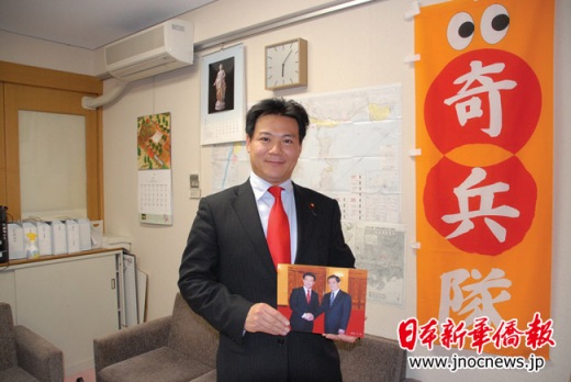 “我是从中国北京大学毕业的第一个日本政治家”。2月16日下午,日本众议员高邑勉在他的办公室里面见到记者的时候,这样高兴地说着。接着,他指着自己与胡锦涛主席的合影,不无得意地说:“去年12月,胡锦涛主席在北京人民大会堂与我们140多名议员见面握手,每个人只有3、4秒的时间。我是民主党访中团里面唯一可以用中文和胡锦涛主席交流的人。我对胡主席用说,‘我是从中国北京大学毕业的。’胡主席握着我的手说:‘好’。”