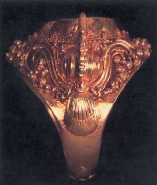 例如附图的印度黄金指环,工艺甚精美,浮雕图案富有民族风格,独特典丽,就是十九世纪初期的代表作。其实,我国晋代时也有錾刻典丽花纹的金指环,当然风格大相径庭,但更如凤毛麟角。
