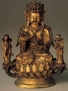 附图的铜鎏金观音菩蕯坐莲像(旁为善财和龙女),则属明代真品。我们必须多接触、多观摩、多钻研,才能鉴别真伪。若仅抱投机赚钱心态,肯定会自食其果。
