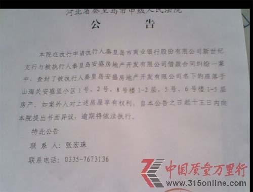 2013年1月10日,焦灼等待中的赵鸿雁发现安盛里小区突然张贴了一张秦皇岛市中级人民法院的“公告”,公告称因开发商安盛公司与秦皇岛市商业银行新世纪支行存在借款合同纠纷,法院查封了安盛公司名下的安盛里小区1号、2号楼(注:实为其中的1-2层),5号、6号楼1-5层房产,8号楼的1-2层房产。“如案外人对上述房屋享有权利,自本公告之日起十五日内向本院提出书面异议,逾期将依法执行。”
