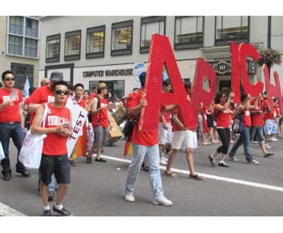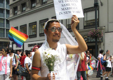 亚裔队伍由巨大的彩虹字幅“Asian Pride”打头阵,数十人演奏亚洲乐器,吸引民众注意力,紧随其后的是专门为亚裔女同志设立的Q-Wave团体。“亚太裔艾滋病联盟”(APICHA)主打“免费HIV检测”计划,近百位身穿红色T恤的成员们手举标语,向沿路民众分发安全套。很多亚裔同志勇敢展示自己,其中不乏华裔身影。一位身穿结婚礼服的亚裔男同志,手举“要求纽约承认同性婚姻”的牌子,表达了同志们的呼声。也有不少同志的支持者参加游行,梁淑仪支持身为女同志的姐姐梁淑安一起来游行,当义工的刘健行和刘素夫妇表示有很多同志朋友,大家都是一样的人,没有什么不同。(刘爽)