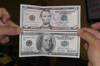 FBI表示,被发现的美金一百元面额假钞,手工精细到不可思议,纸质比真钞薄,他们在百元假钞右方发现五元面额的防伪线条,猜测是假钞制造商将美金五元面额纸钞,重新洗印上一百元钞票图案。