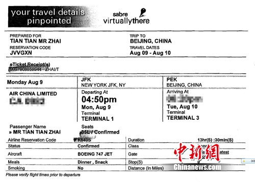 据了解,翟田田所乘坐的从纽约肯尼迪国际机场直飞中国北京的航班,将于10日下午抵达北京,届时翟田田的亲友将在北京接机。(完)