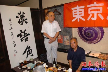 交流会上展示了旅日华人书法家熊峰和日本书法家冢越诚分别题写的“汉语角”,受到大家的好评。