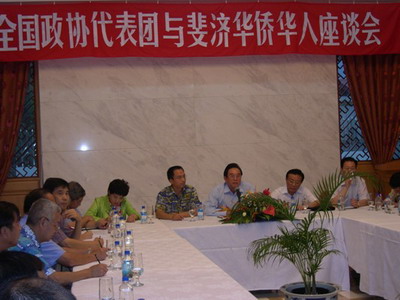 中新网8月13日电 据中国外交部网站消息,8月12日,正在斐济访问的全国政协港澳台侨委员会陈云林主任一行,在中国驻斐济大使馆与旅斐华侨华人代表举行座谈会。使馆临时代办费明星主持,斐济中国和平统一促进会会长袁炳棠、斐济华人协会会长司徒新耀等侨领,及华文媒体代表出席。