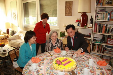 韩女士虽已年逾九十高龄,但精神矍铄、谈吐流利,依然时刻关注着中国的进步和发展。在交谈中,她衷心感谢吴大使夫妇专程赶来洛桑为其庆生,表示,使馆的惦记和关怀让她感到无比温馨。她祝祖国繁荣昌盛,人民幸福安康。