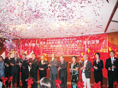 中新网9月28日电 据加拿大《明报》报道,加拿大温哥华中华会馆联合侨团暨各界人士庆祝中华人民共和国成立61周年及中加建交40周年晚会26日晚举行,三级政要、侨团代表及超过600名嘉宾应邀出席,场面盛大,在中国驻温哥华总领事梁梳根及温哥华中华会馆副理事长麦伯强带领下,与会者共祝“中加国运昌隆,友谊万古长青”。