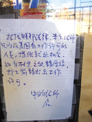报道指出,在7日执法行动中有一名石姓女子被捕的中日职业介绍所仍继续关门,8日一早门上就张贴出中英文告示,明确告诉找工者必须有工作许可证。