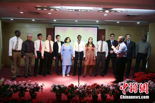 中新网北京10月21日电 第48期全国侨务干部培训班学员21日晚与正在北京华文学院研修的来自尼泊尔、缅甸、塞拉利昂、老挝、越南等22个国家的“发展中国家商务部门官员汉语研修班”学员进行联欢。