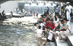 王某一家人从免税店出来走向清溪川。清溪川是在中国也很有名的旅游景点。虽然是晚间时分,但天气依然炎热。王某的两个儿子跳入水中。稍后而来的其他游客也脱掉鞋子进入水中。一位游客说:“很凉快,很舒服。孩子们也很喜欢。在城市中心建设小溪,感到很羡慕。”