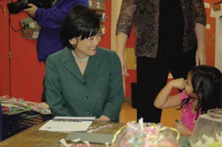 中新网10月28日电 据美国《侨报》报道,美国华裔国会众议员赵美心26日到洛杉矶联合学区视察学前班,推动她将起草的“全球语言早期教育挑战基金提案”。赵美心表示,与世界其它先进工业国家相比,美国的外语教育相当落后,她希望能够立法促进美国的早期外语教育。这一法案若获通过,联邦将设立1亿美元基金,鼓励公立学校的外语教育。图为赵美心在与一名学前班小朋友交谈。(文/图 邱晨)