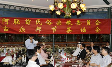 阿联酋华人华侨联合会民族宗教事务委员会于2010年11月18日中午在迪拜麻扎耶商务中心隆重举办2010年古尔邦节茶话会,我驻迪拜总领事詹京保夫妇、驻迪拜总领馆胥昆领事、迪拜警察学院语言中心主任伊萨姆博士、当地侨领、中资新闻媒体及回族、维吾尔族、哈萨克族侨胞代表五十余人应邀出席了茶话会。