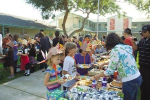在18日的感恩节聚会上,家长们与老师们配合,给孩子送上美味的食品。(蔚宇)