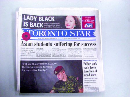 中新网11月22日电 据加拿大《明报》报道,针对《多伦多星报》(Toronto Star)在10日发表的一篇名为《亚裔学生被迫入大学》的报道,该报在20日的社论版上刊登了由该报独立监察员英格利希(Kathy English)撰写的一篇文章,承认该报将有关“条条大路、成功之道”研讨会的报道与《麦克琳》(Maclean's)杂志颇具争议性的报道融为一体,在处理新闻的敏感性方面未能达到该报的标准。