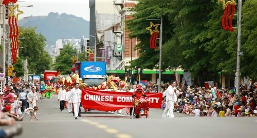 在醒目的“中华社区”英文横幅后面,是幅面巨大的五星红旗和新西兰国旗。两面旗帜都是3米宽5米长,合计面积达到30平方米,需要12个人共同擎举,极为引人注目。华人队伍声势浩大,锣鼓喧天,红旗招展,观众们看到队伍过来,远远就开始热情鼓掌欢迎,主持人还组织观众学着用中文齐声高喊:“你好!”形成一股巨大的声浪,向中华社区方阵致意,向基督城华人问好。