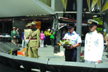 曾筱龙代表纽省政府向纪念碑献上鲜花。代表退伍华裔军人献花的为澳洲华裔退伍军人全国团聚协会主席TOM CHEONG及RAYMOND TAI。