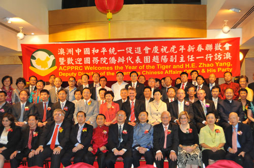 当晚,澳洲中国和平统一促进会为艺术团全体成员举行了盛大的欢迎晚宴,中国驻澳大利亚大使章均赛、驻悉尼总领事胡山,澳大利亚联邦政府代表劳瑞﹒弗格森、联邦反对党领袖代表菲力蒲﹒卢铎,新南威尔士州州长代表巴巴拉﹒佩里、州反对党领袖代表迪丝﹒伯雷季等政要同澳洲中国和平统一促进会会长邱维廉、荣誉会长周光明、新州华人团体协会主席吴昌茂以及当地华社各界人士近600人出席。