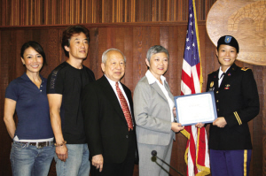 为表彰哈岗学区西点军校第一人,学区官员向曹佩毓颁发了荣誉状,并与她合影留念。(高睿)