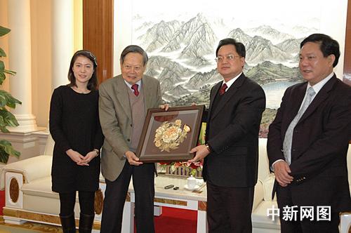 中新社汕头十二月二十日电 (李怡青 陈妍)著名美籍华裔科学家杨振宁受广东潮州市委市政府邀请到潮州讲学。二十日下午,广东潮州市委书记骆文智在潮州迎宾馆会见了杨振宁及其夫人翁帆女士。潮州是翁帆女士的故乡,这也是杨氏伉俪婚后第一次回到潮州。